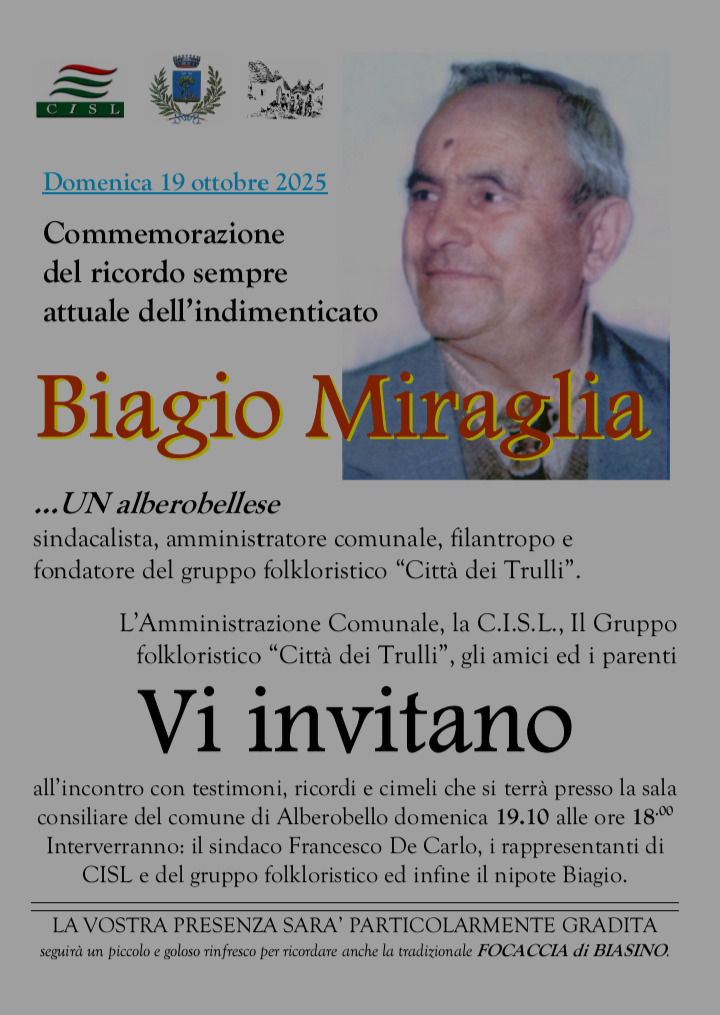 L’Amministrazione comunale di Alberobello celebra domenica 19 ottobre, alle ore 18.00, presso la Sala Consiliare Gianpiero De Santis, il trentesimo anniversario della scomparsa di Biagio Miraglia, figura di grande rilievo nella storia cittadina.