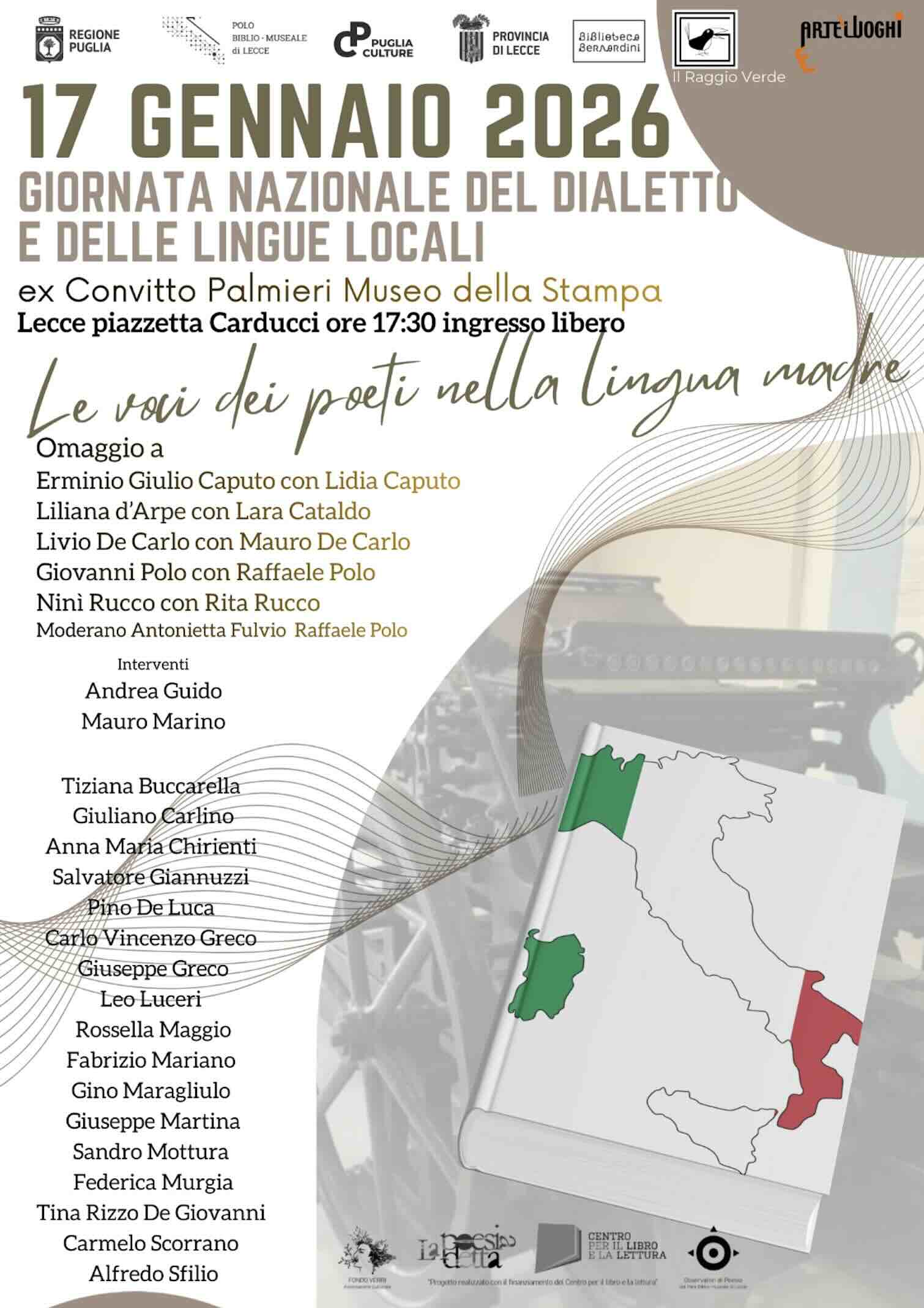 La voce dei poeti nella lingua madre, un annuncio che è programma di tutela di un patrimonio linguistico e culturale che rappresenta radici, identità e memoria. La casa editrice Il Raggio Verde, la Biblioteca Bernardini e il Polo Biblio-museale di Lecce con il Fondo Verri, gli Osservatori di Poesia nell’ambito del progetto “La Poesia detta” celebrano sabato 17 gennaio 2026, all’interno della Fabbrica delle Parole, tra le macchine che costituiscono il cuore del Museo della Stampa nella Biblioteca Bernardini, la Giornata nazionale del dialetto e delle lingue locali.