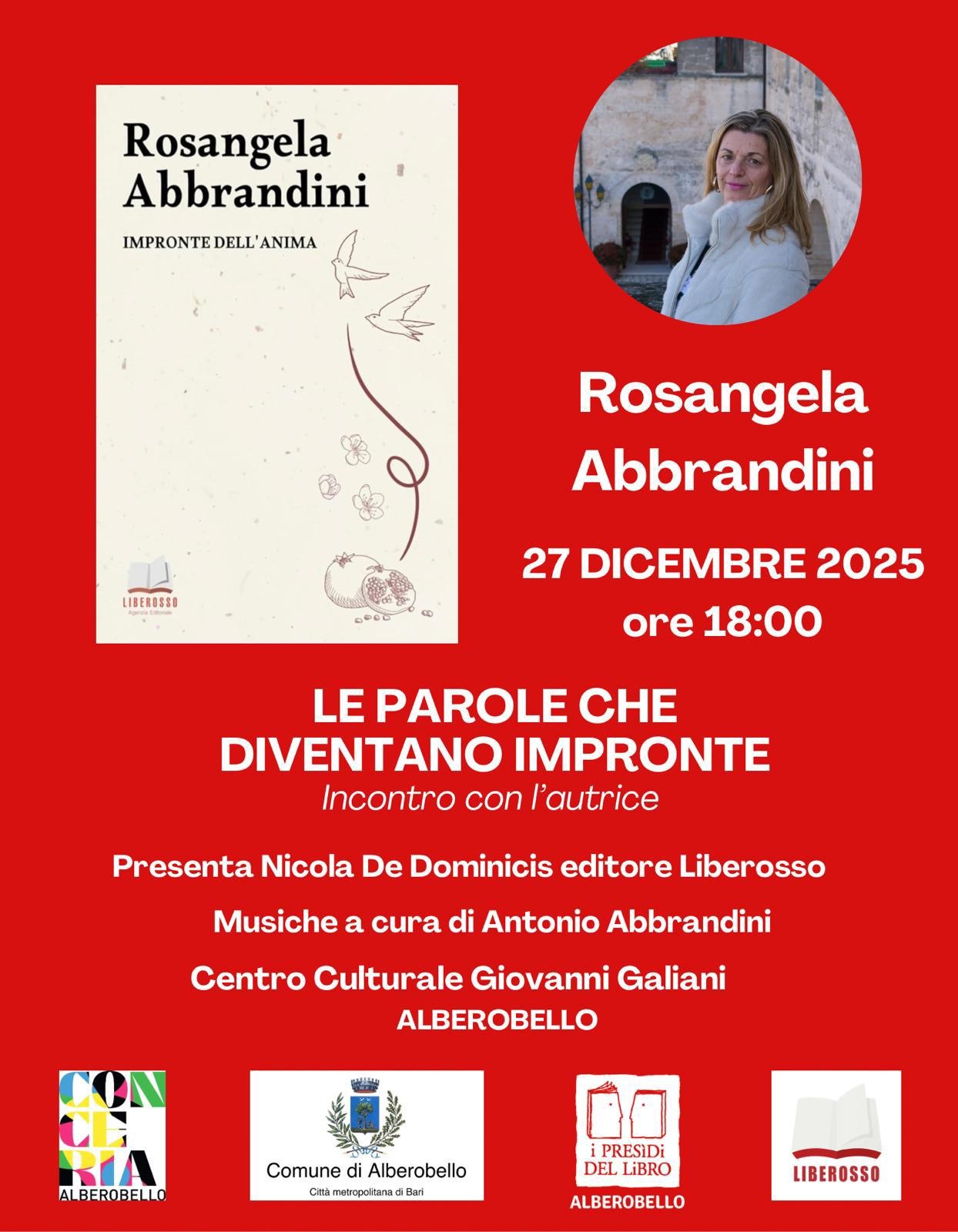 Alberobello si conferma città attenta alla cultura e alla promozione della lettura. Venerdì 27 dicembre 2025, alle ore 18.00, presso il Centro Culturale “Giovanni Galiani”, si terrà l’incontro “Le parole che diventano impronte”, appuntamento promosso dai Presìdi del Libro di Alberobello con il patrocinio del Comune di Alberobello.