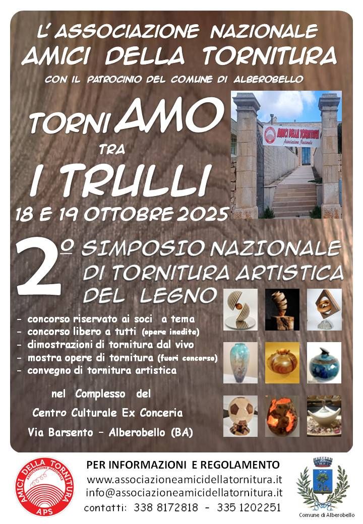 Il 18 e 19 ottobre 2025 Alberobello diventa ‘capitale’ della tornitura artistica del legno con “TorniAmo tra i Trulli”, l’evento promosso dall’Associazione Nazionale Amici della Tornitura che si terrà presso il Centro Culturale Galiani (ex Conceria) in via Barsento.