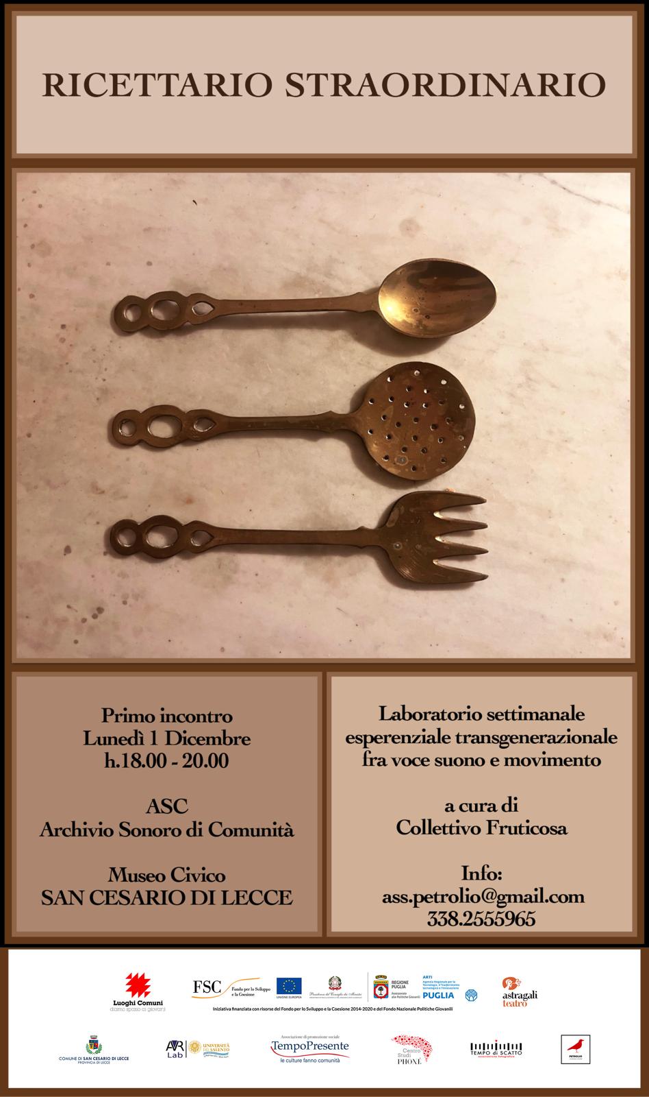 Prende il via lunedì 1° dicembre, dalle 18 alle 20, presso la sede dell’ASC - Archivio Sonoro di Comunità nel Museo Civico di San Cesario di Lecce, il Ricettario Straordinario, Laboratorio esperienziale transgenerazionale fra voce, suono e movimento, creato all’interno del progetto “Da qui si vede tutta la città”.