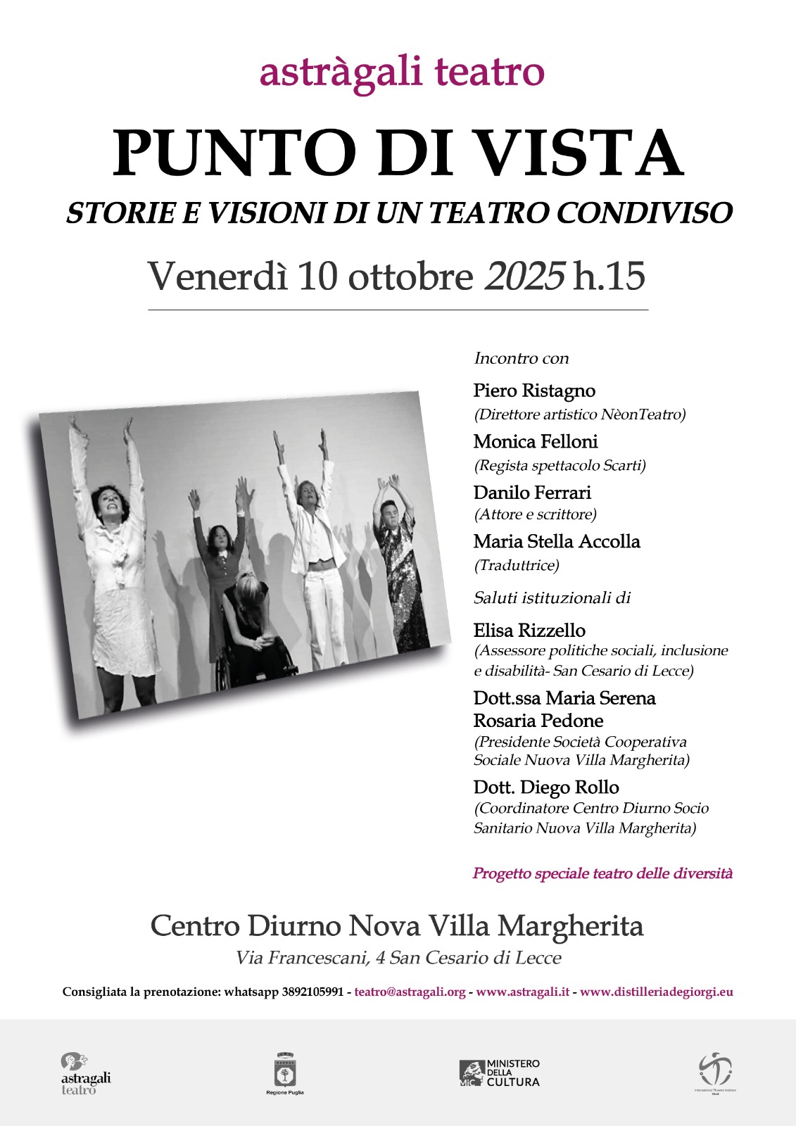 Alle 15, nel Centro Diurno “Nuova Villa Margherita” di San Cesario di Lecce, è previsto l’incontro pubblico “Punti di vista. Storie e visioni di un teatro condiviso”, che si apre con i saluti istituzionali di Elisa Rizzello, Assessore alle politiche sociali, dell'inclusione e per la disabilità del Comune di San Cesario di Lecce, Maria Serena Pedone, Presidente della Società Cooperativa Sociale “Nuova Villa Margherita” e Diego Rollo, Coordinatore del Centro Diurno Socio Sanitario “Nuova Villa Margherita”. Intervengono sui temi dell’inclusione e della disabilità nell’ambito teatrale e professionale, portando la propria esperienza come esempio, Piero Ristagno, direttore artistico NèonTeatro, Monica Felloni, regista dello spettacolo “Scarti”, Danilo Ferrari attore e scrittore, e Maria Stella Accolla, traduttrice di Danilo Ferrari.