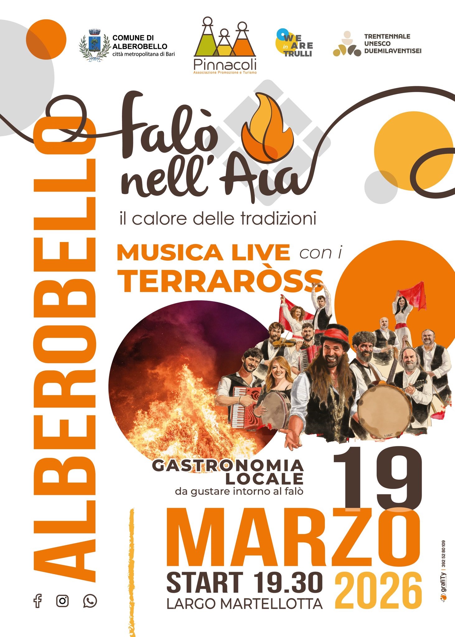 A partire dalle ore 19.30 in Largo Martellotta, il cuore della Città dei Trulli tornerà ad accendersi attorno al grande falò ispirato alla tradizione dei fucarazz di San Giuseppe, quando nei rioni si accendevano fuochi attorno ai quali famiglie e vicinato si ritrovavano per condividere storie, canti e momenti di convivialità.