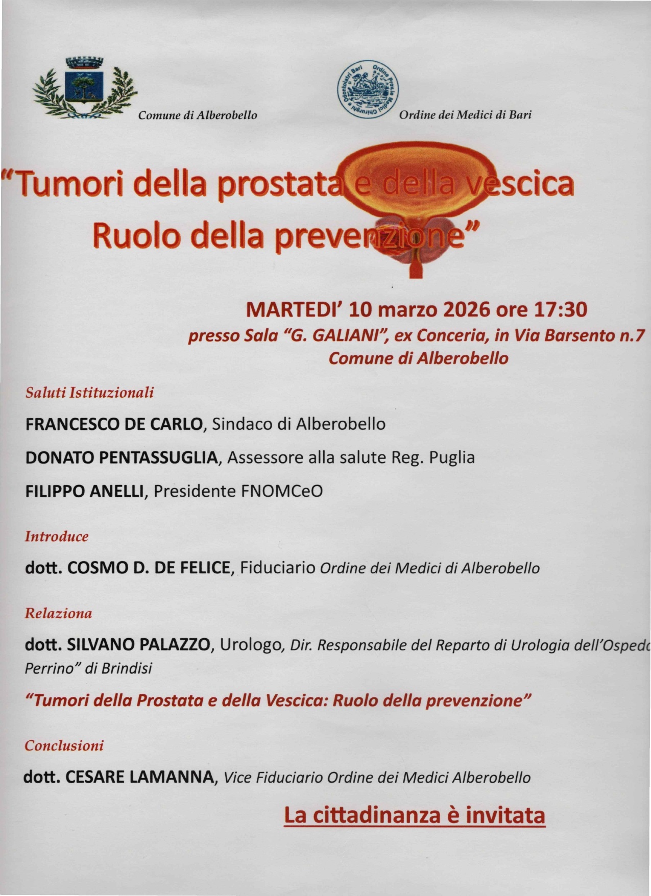 “Prevista per martedì 10 marzo 2026 presso la Sala del Centro Culturale ‘G. Galiani’ ad Alberobello, la prossima iniziativa, promossa dall’Ordine dei Medici di Bari e patrocinata dal Comune, assume un valore speciale poiché rivolta a un target tradizionalmente meno propenso alla prevenzione: gli uomini.”