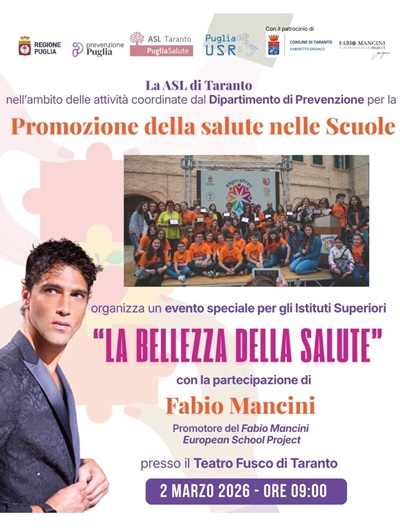 Taranto - Il 2 marzo 2026, alle ore 9:00, il Teatro Fusco di Taranto ospita l’evento straordinario “La bellezza della salute”; l’iniziativa promossa dalla ASL di Taranto, sotto il coordinamento del Dipartimento di Prevenzione, rappresenta un passo significativo verso la promozione della salute tra la popolazione giovanile, in linea con il programma “Scuole che promuovono salute” del Piano Regionale della Prevenzione 2021-2025.