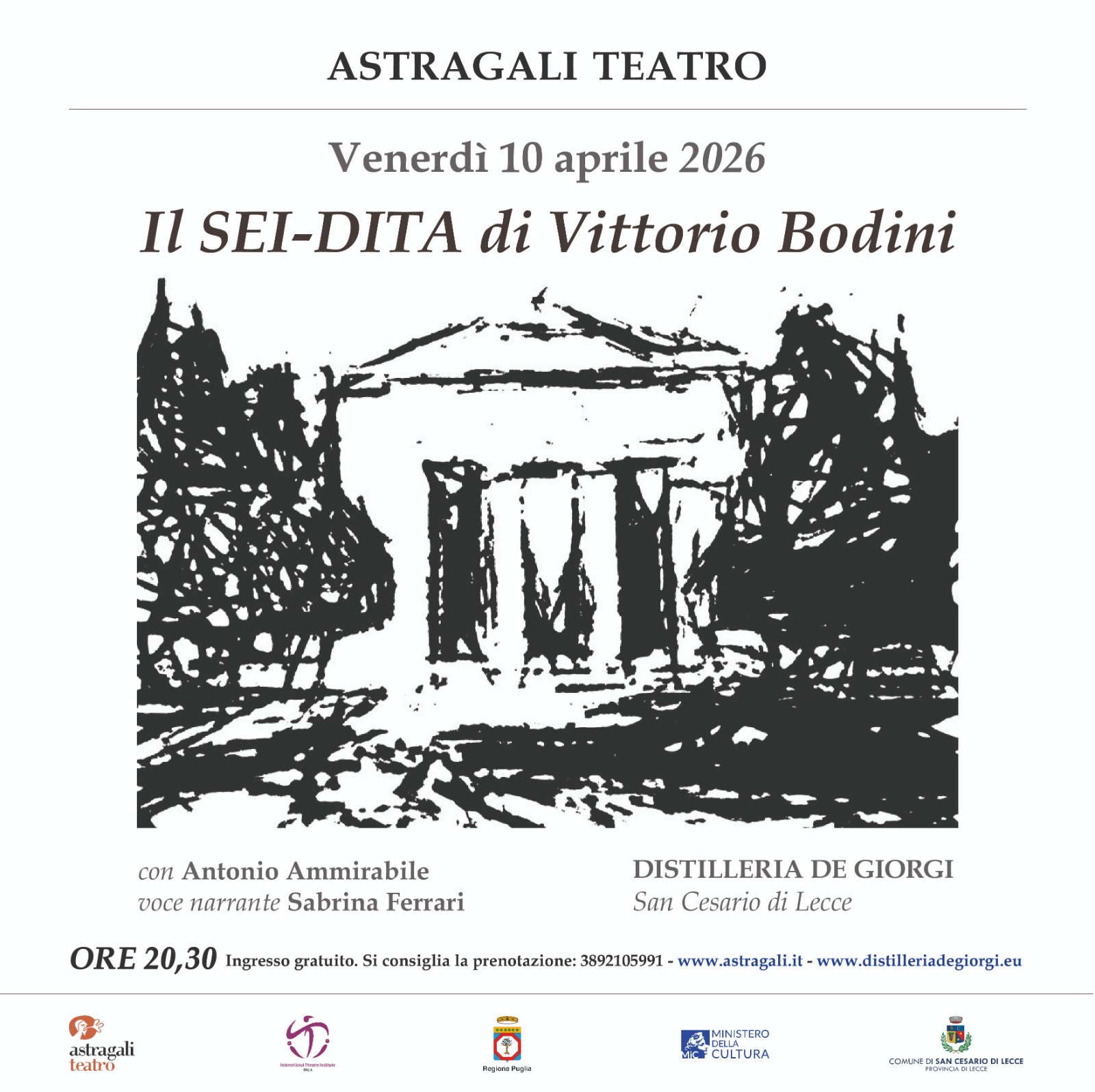 La scrittura di Vittorio Bodini è protagonista, venerdì 10 aprile 2026, alle 20.30, negli spazi della Distilleria di San Cesario di Lecce, dello spettacolo “Il Sei - Dita”, proposto da Astràgali Teatro nell’ambito della rassegna “Visioni dal Paese Grande”.